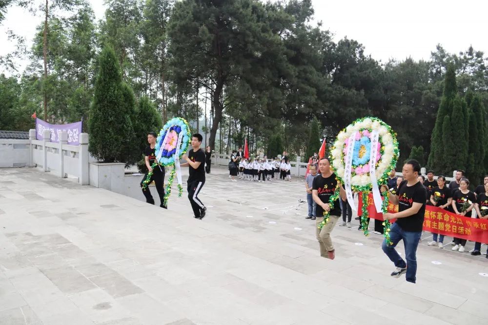 清风寄哀思,翠柏传敬意。在庄严肃穆的乐声中,向革命烈士敬献花圈。敬献花圈结束后,全体党员干部默哀三分钟,表达对革命先烈诚挚的敬意和深深的怀念。默哀毕,在纪念碑前,全体党员干部面向鲜红的党旗,重温入党誓词,铮铮誓言无不彰显共产党人的使命和担当!随后面向着纪念碑,集体朗诵《缅怀烈士诗歌》。最后全体党员绕革命纪念碑一周,依次将鲜花摆在纪念碑前寄托哀思。