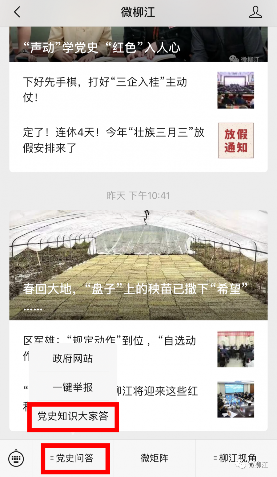 进入“微柳江”官方微信公众号,点击下方“党史问答”菜单栏,直接进入“党史知识大家答”学习界面。