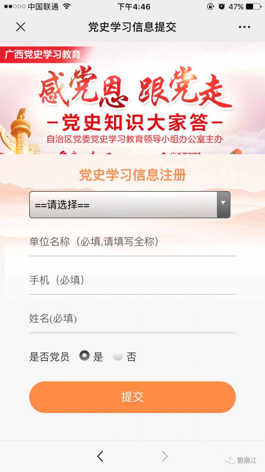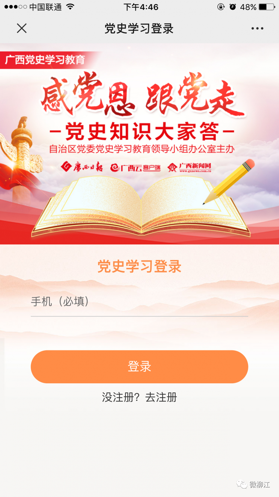 首次登录请先注册基础学习信息,注册流程为:选择所在县区——柳江区,填入单位和手机号,单位必须写清楚具体名称,即可登录学习;再次登录,只需填入手机号即可登录学习。