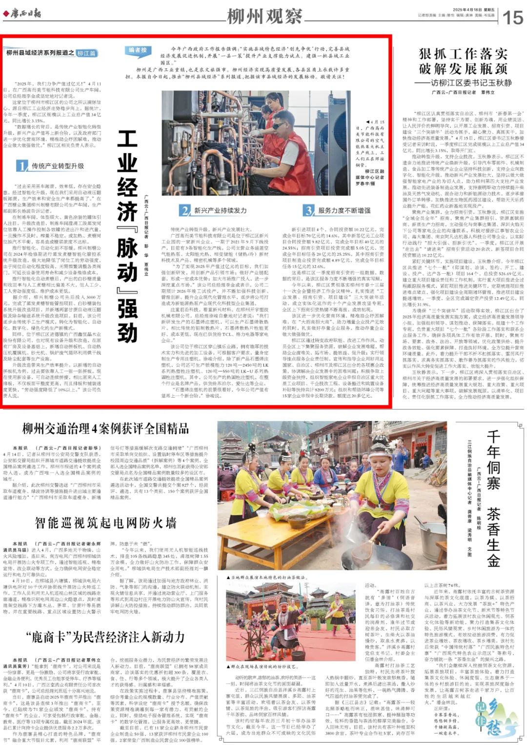 4月18日,《广西日报》“柳州观察”推出“柳州县域经济”系列报道首篇——柳江篇《工业经济“脉动”强劲》。报道柳江区以“工业发展、招商引资、项目建设”三个突破年活动为抓手,进一步优化营商环境,精准助企纾困解难,推动传统产业智能化升级与新兴产业快速发展双轮驱动,实现工业经济高质量发展强劲脉动。