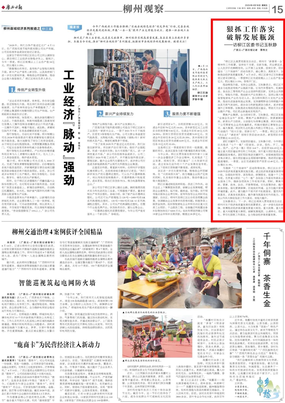 4月18日,《广西日报》“柳州观察”刊发文章《狠抓工作落实 破解发展瓶颈——专访柳江区委书记玉秋静》。全面展现柳江区深入贯彻自治区、柳州市“新春第一会”精神,扎实推进产业转型升级,全力招商引资,加快项目建设,有力推动经济高质量发展,实现一季度“开门红”。
