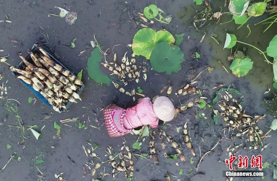 广西柳州市柳江区百朋镇,当地农民在采收莲藕。