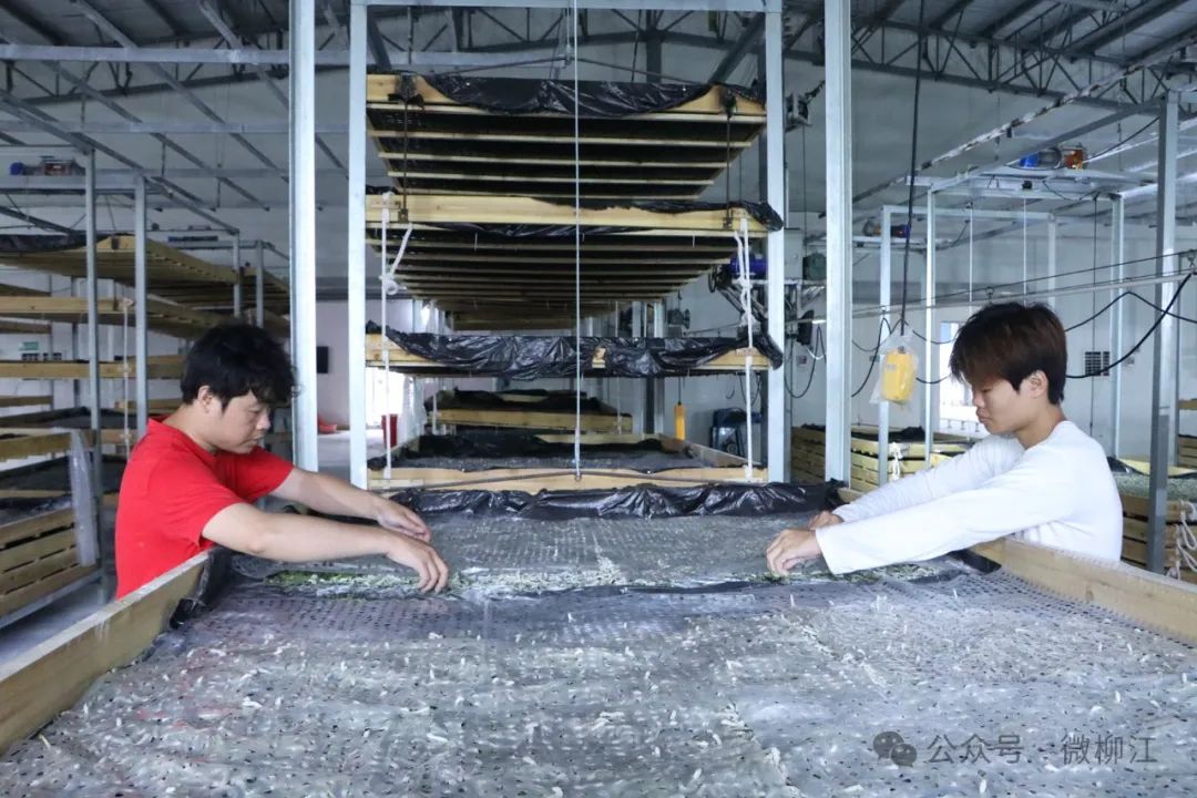 5月8日,记者来到位于里高镇三合村弄麦屯的广西蚕宗农业发展有限公司桑蚕养殖基地。走进蚕房,一排排竹制蚕匾整齐码放,嫩绿的桑叶铺满匾底,幼蚕正蠕动着身躯啃食桑叶。蚕农黄华英手法娴熟地将新鲜桑叶撕成碎片,均匀地撒在蚕匾中,为幼蚕提供丰富的食料。