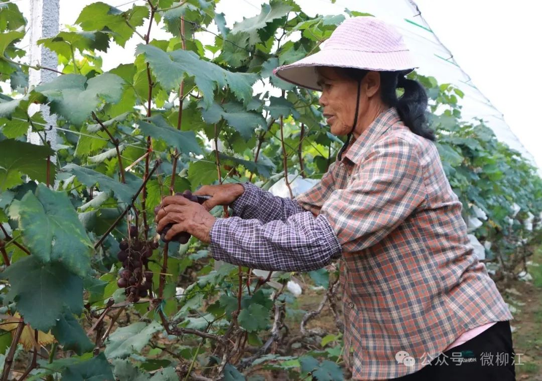 盛夏时节,柳江区成团镇鲁比村葡萄大棚内一片生机盎然,整齐的葡萄架上,深绿藤蔓如绿色绸带缠绕攀爬,一串串葡萄紧密簇拥,颗颗饱满,似紫宝石般在阳光下闪烁诱人光泽,浓郁果香弥漫在空气中,宣告着又一个丰收季到来。