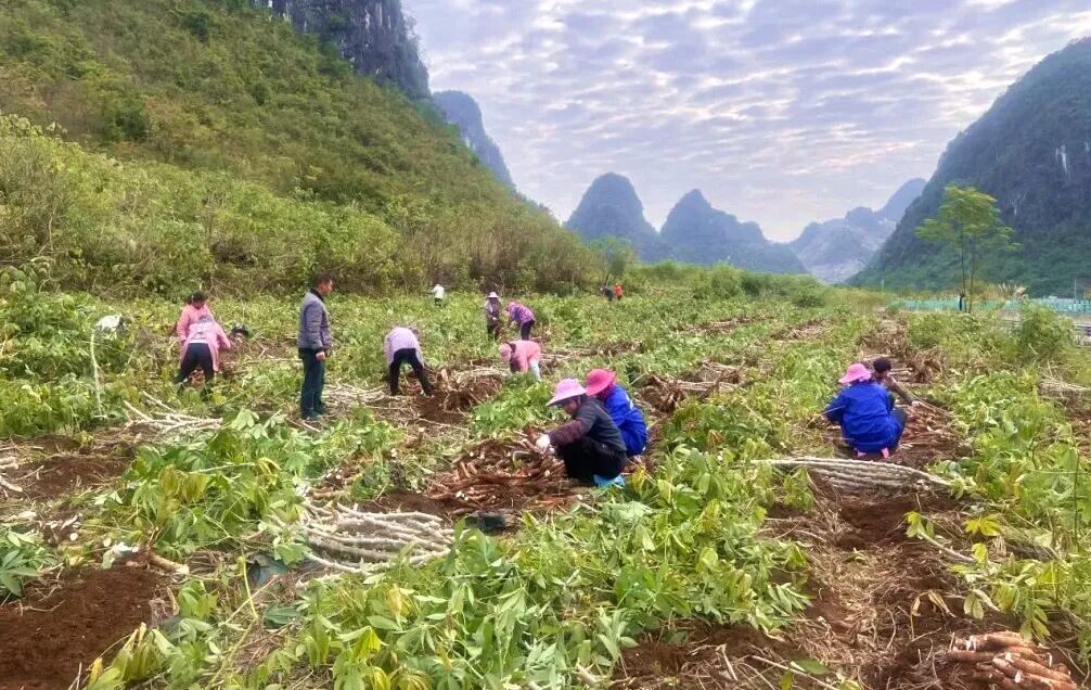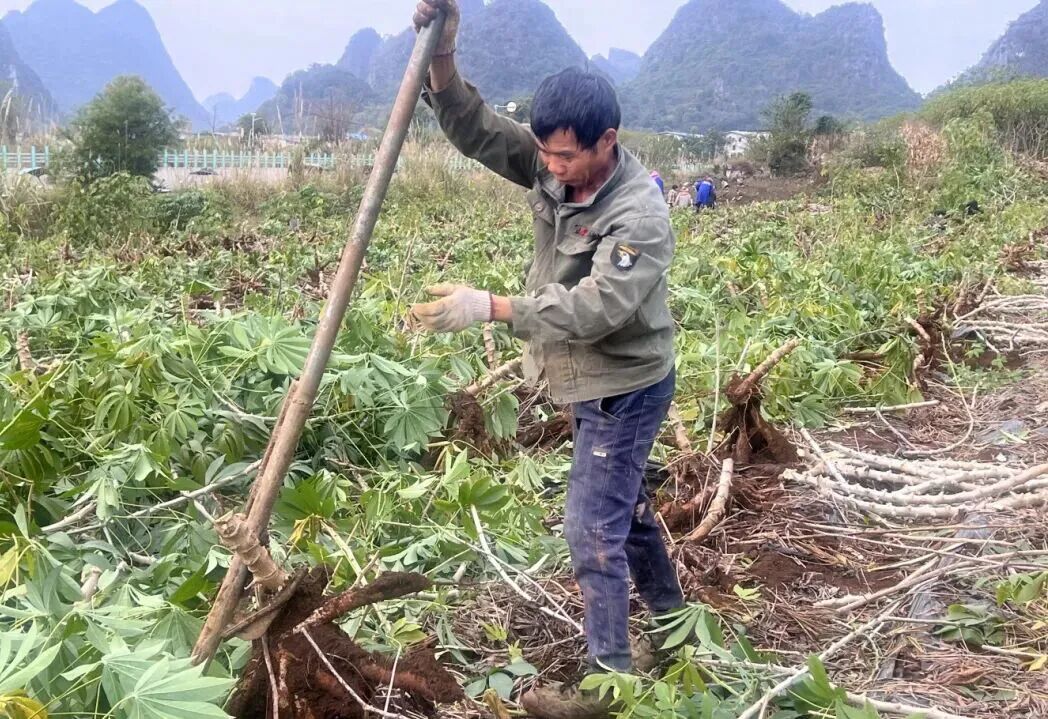 “今年我种植170亩木薯,亩产量预计能达到4000斤左右,长势特别喜人!”种植户覃军福一边麻利地采收,一边笑着说,“这批木薯采收完毕后,将统一供应给合作的木薯深加工企业,经过加工、包装后,销往全国多地市场,不仅销路稳定,价格也有保障。”