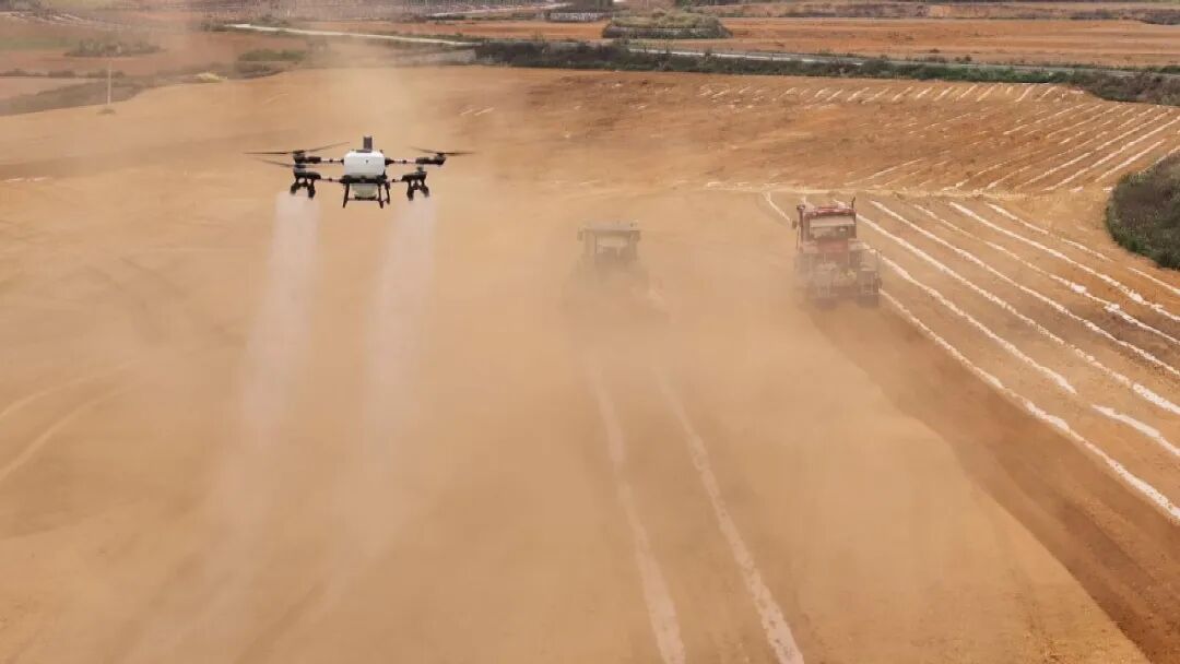 不仅如此,刚种下的蔗地还迎来了“空中来客”。技术人员操控的植保无人机腾空而起,按照预设航线进行精准洒药水,对蔗田全面封闭除草,为甘蔗稳产高产打下坚实基础。
