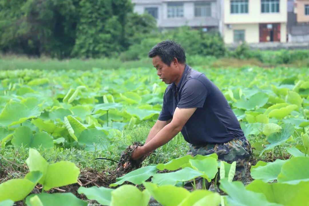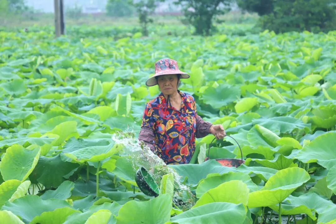 “现在是莲藕生长关键期,管护不能马虎,草要除干净,水要管到位,肥也要适时跟上,这样藕才能长得壮、品质好。”藕农覃宽景一边给藕田施肥,一边笑着说道,“我种植了6亩莲藕,今年气候条件适宜,藕苗长势喜人,期待能有个好收成。”