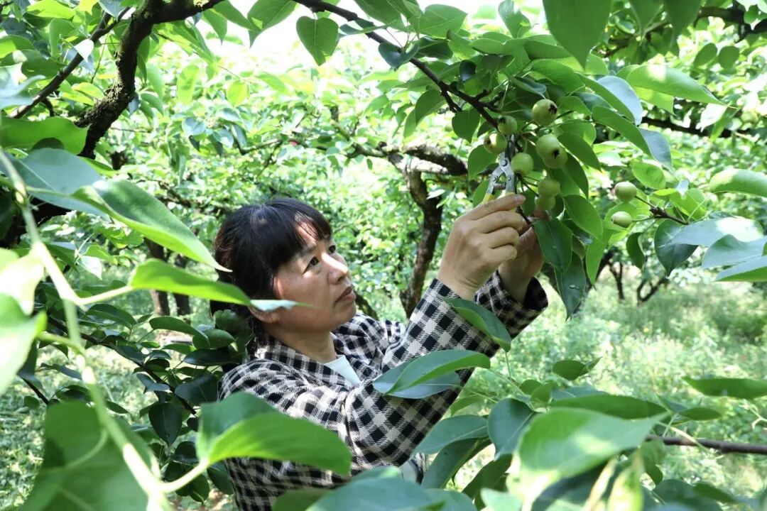 时下气候适宜、雨水充沛,青花梨迎来枝条旺长、幼果初挂的关键阶段,精细化管护成效直接决定果实品质与全年总产量。在保仁村板汪屯的梨园里,种植户黄炳智手握修枝剪,专注地进行疏果作业,仔细剪除徒长枝、病弱枝与过密枝条,确保每一颗幼果都能享受充足光照与养分,为后续膨果提质打好基础。