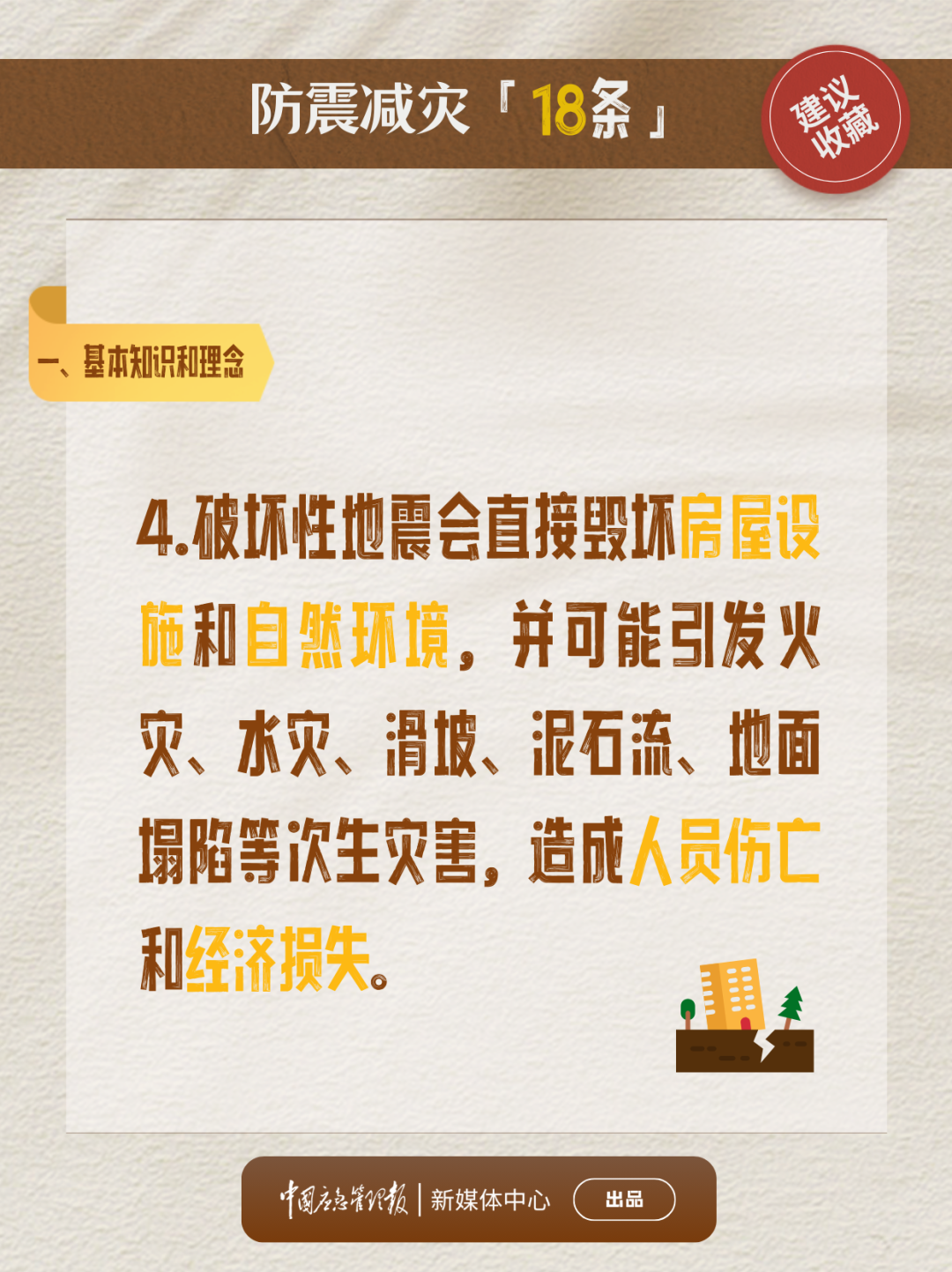 4.破坏性地震会直接毁坏房屋设施和自然环境,并可能引发火灾、水灾、滑坡、泥石流、地面塌陷等次生灾害,造成人员伤亡和经济损失。