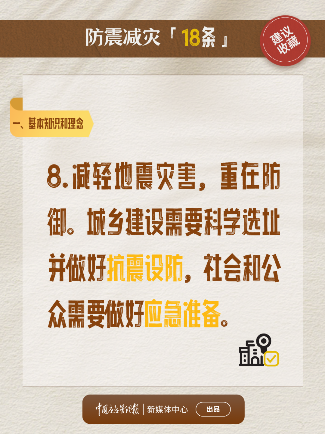 8.减轻地震灾害,重在防御。城乡建设需要科学选址并做好抗震设防,社会和公众需要做好应急准备。