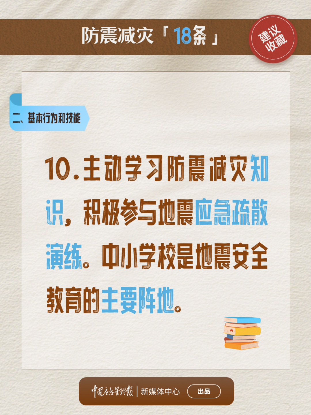 10.主动学习防震减灾知识,积极参与地震应急疏散演练。中小学校是地震安全教育的主要阵地。