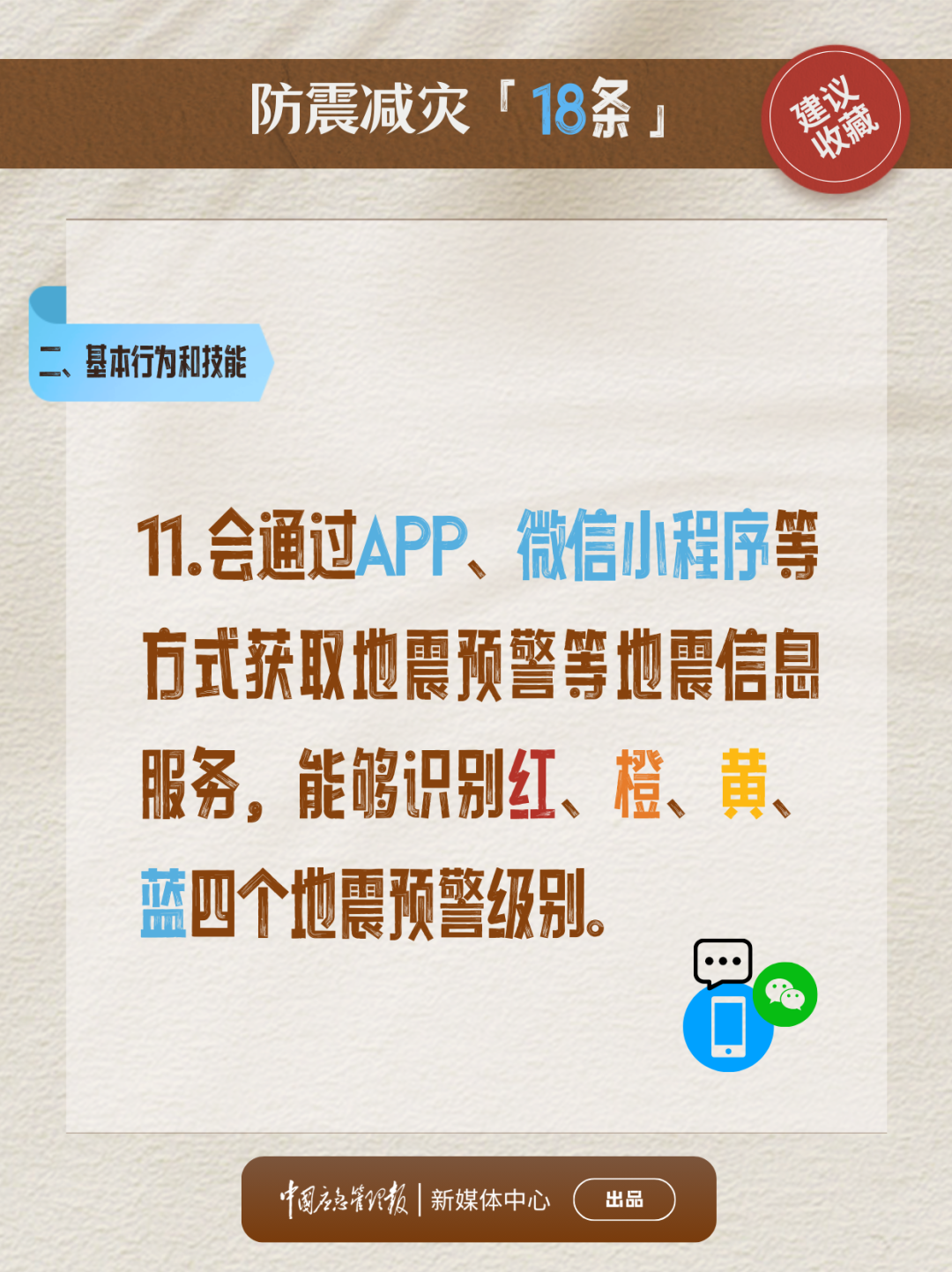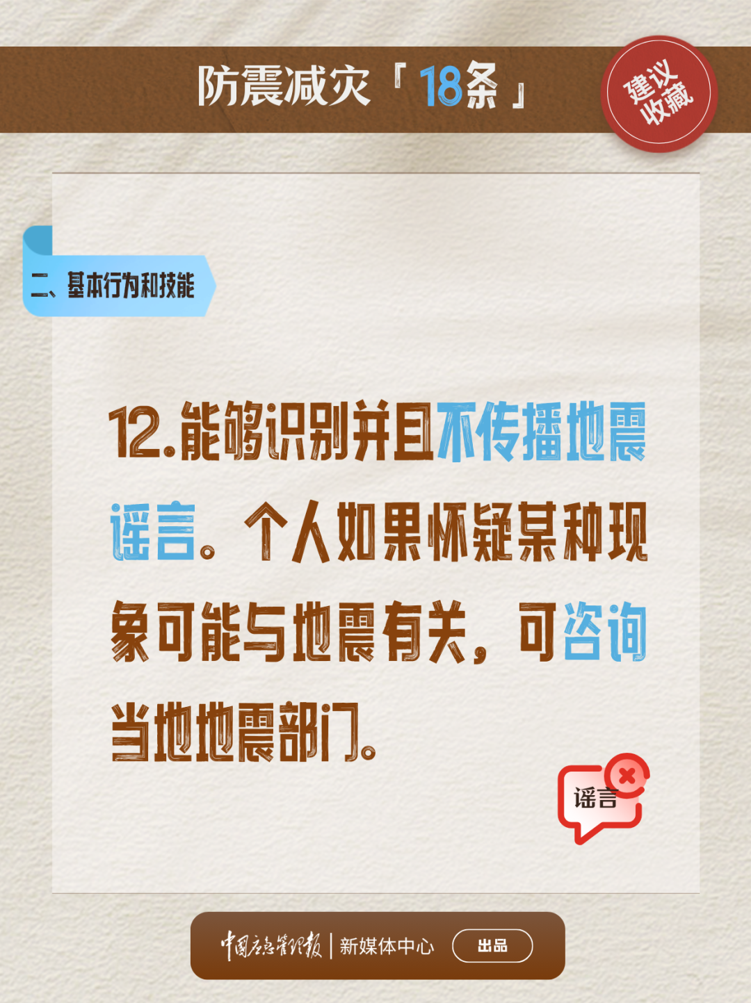 12.能够识别并且不传播地震谣言。个人如果怀疑某种现象可能与地震有关,可咨询当地地震部门。