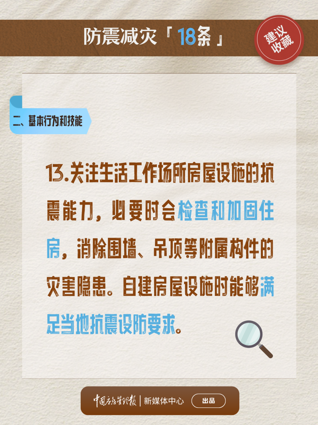 13.关注生活工作场所房屋设施的抗震能力,必要时会检查和加固住房,消除围墙、吊顶等附属构件的灾害隐患。自建房屋设施时能够满足当地抗震设防要求。