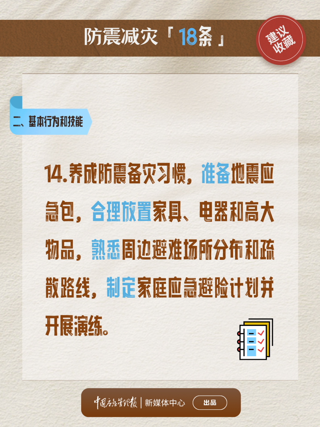 14.养成防震备灾习惯,准备地震应急包,合理放置家具、电器和高大物品,熟悉周边避难场所分布和疏散路线,制定家庭应急避险计划并开展演练。