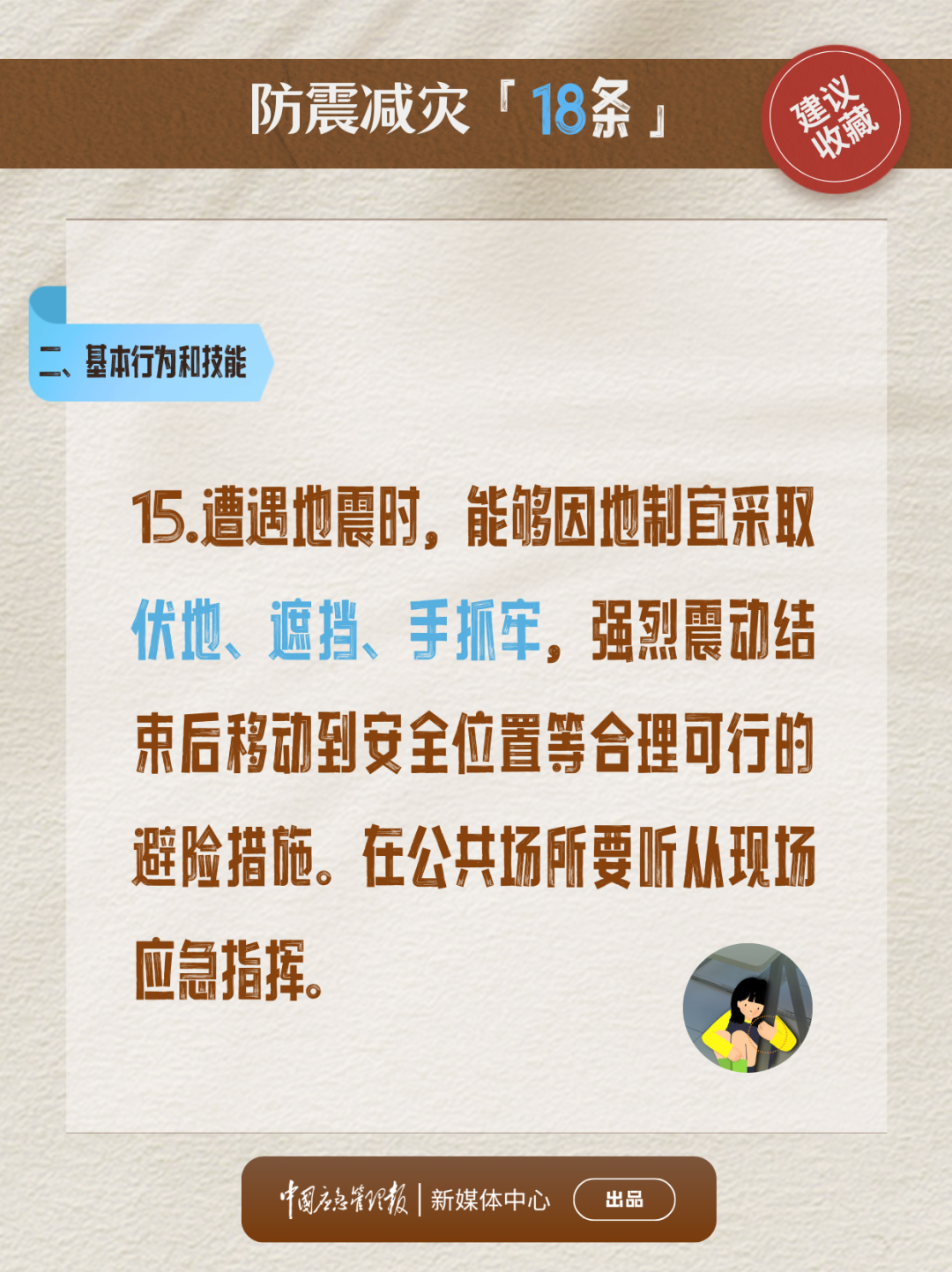 15.遭遇地震时,能够因地制宜采取伏地、遮挡、手抓牢,强烈震动结束后移动到安全位置等合理可行的避险措施。在公共场所要听从现场应急指挥。