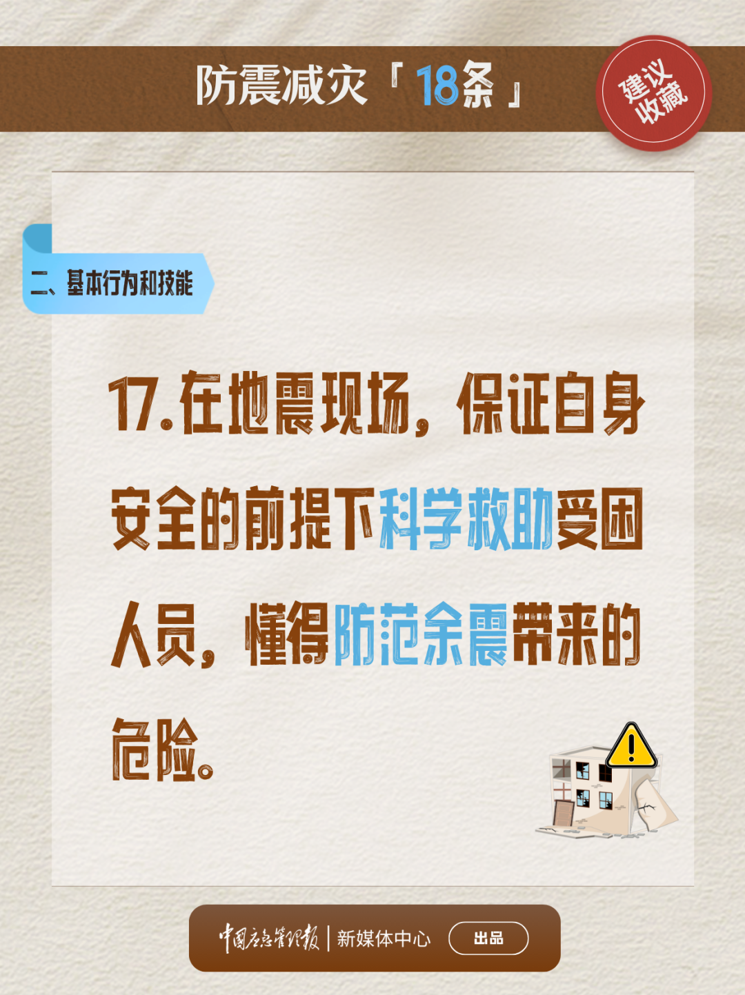 17.在地震现场,保证自身安全的前提下科学救助受困人员,懂得防范余震带来的危险。