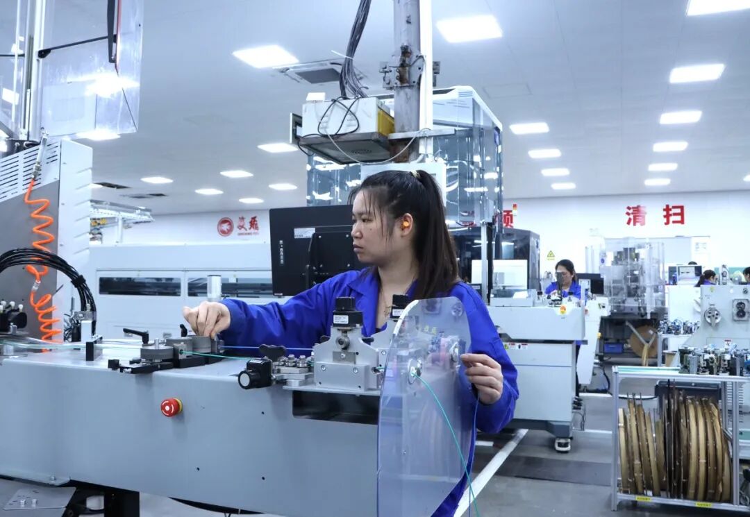 “我们从去年5月开始引进全自动多线合压机,可精准完成多根电线连接、端子压接等复杂工序,全面替代传统加工模式,生产产能提高50%,人工成本大幅节约。”该公司设备主管谭琦璇介绍道。