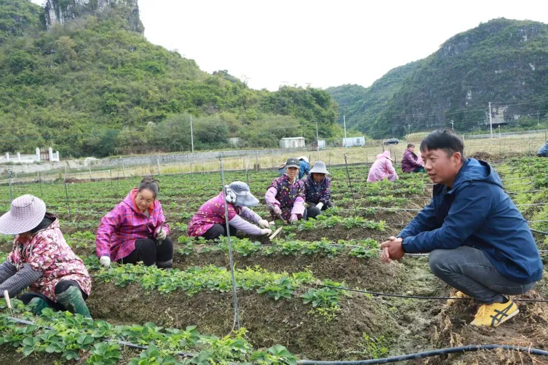韦应成(右一)向村民了解草莓种植情况。