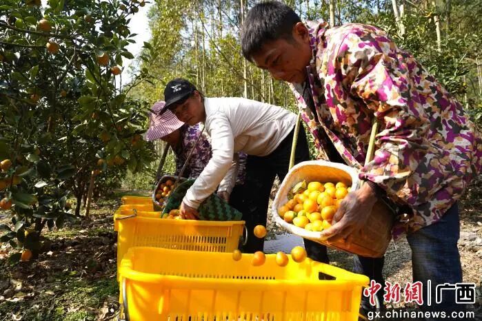 冬日时节,位于广西柳州市柳江区土博镇水源村的柳州市甘牛果树种植农民专业合作社金桔种植基地里,50多位工人指尖翻飞,采摘金桔;路旁,一筐筐脆蜜金桔堆成金色小山,晶莹透亮,香气扑鼻,等候发往全国各地市场。