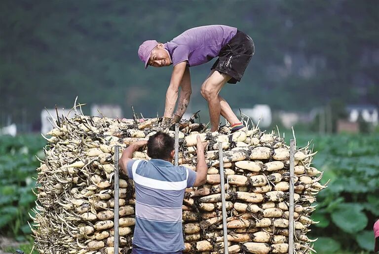 在柳江区百朋镇怀洪村,藕农在装运莲藕。