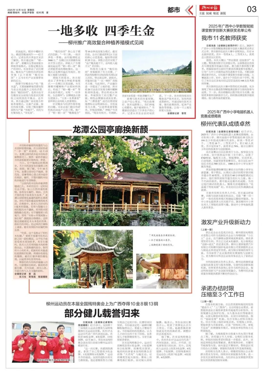 围绕不同需求,我市探索出了多种复合种植养殖模式——在柳江区里高镇,为支撑柳州螺蛳粉产业原材料供应,形成了“稻—螺—虾”等共生轮作模式,实现“一田多收、生态循环”;在柳城县古砦仫佬族乡,“玉米—水果番茄”套种则让亩均收入显著增加。