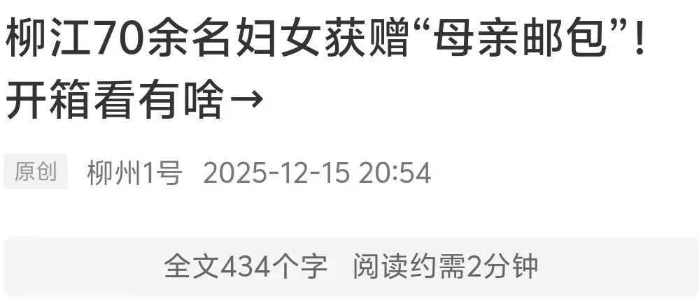 活动现场,工作人员将满载爱心的“母亲邮包”逐一送到柳江区70余名困境妇女手中。邮包内包含血压计、护腰带、护颈带等健康防护用品,以及应急包、床上用品等家庭实用品,汇聚着无数爱心人士的关怀。收到邮包的妇女们难掩喜悦,有人还唱响自编山歌表达谢意,“母亲邮包”与朴实的歌声,让冬日村屯洋溢着浓浓暖意。