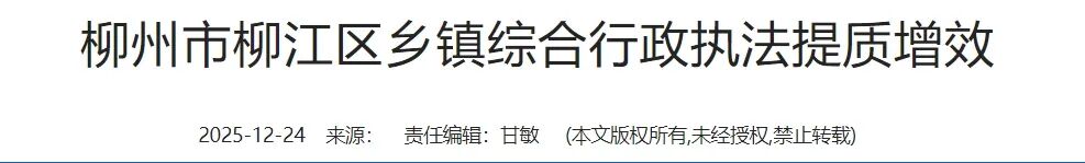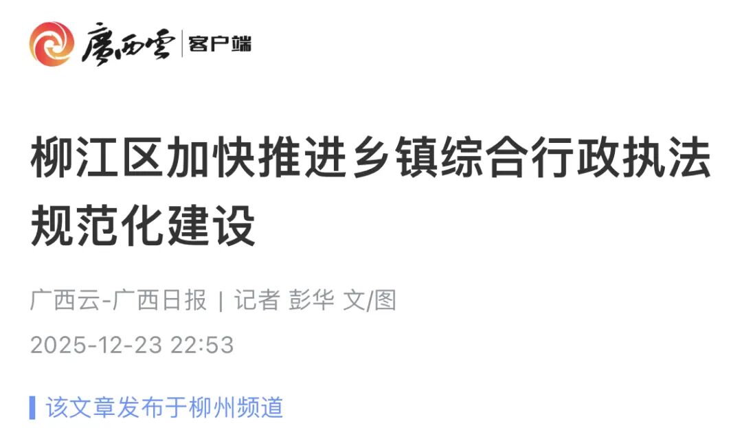 12月22日,柳州市柳江区召开新闻发布会,系统介绍乡镇综合行政执法规范化建设成果。近年来,柳江区通过“两方案、两清单、一意见、一指引”等制度设计,构建起区镇联动、权责清晰的基层执法体系,探索出一条具有地方特色的执法规范化路径。