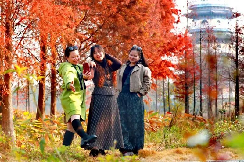 临近午时,岜公塘公园被暖阳晕染出温柔底色,成为新城冬日里的“自然画廊”。澄明湖水倒映着高远晴空与静立塔影,景观桥与蜿蜒栈道间,游人悠然漫步。最动人的莫过于园内水杉林,锈红、赭黄与深棕层层叠叠,与碧水蓝天相映成趣,宛如浓墨重彩的油画。“夏天满眼绿意,冬天五彩斑斓,在城市里就能邂逅这样的美景,太惬意了。”市民黄雪映用手机记录下这份美好,如画景致也吸引着众多市民游客驻足打卡,定格冬日限定浪漫。