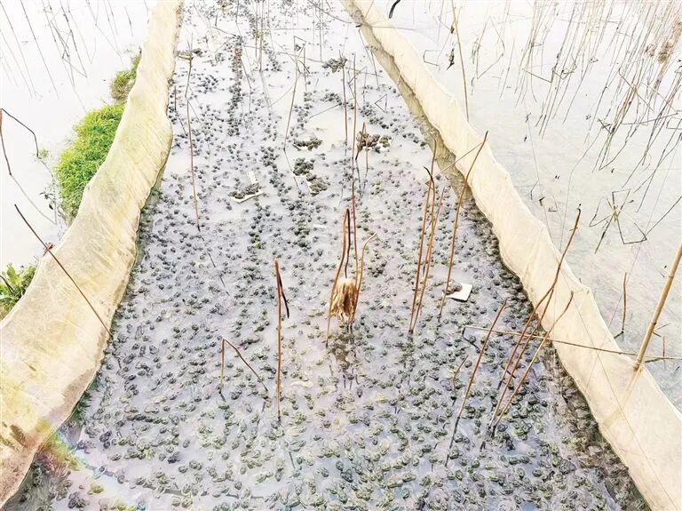 该牛蛙试点养殖基地是田园间的一片藕塘,塘内流水潺潺,这里正是牛蛙的“集体宿舍”。牛蛙们挨挨挤挤端坐在塘里,一两只牛蛙腾起落水,惊动周边一片,溅起的水花热闹了蛙池。