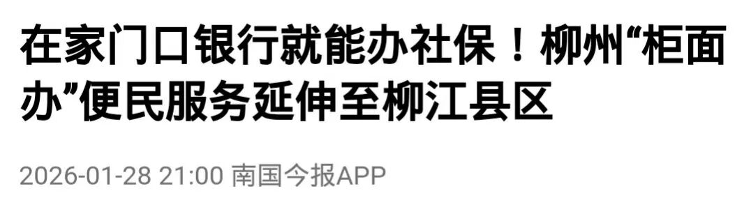 “现在好了,不用大老远跑市里社保局,在柳江县的工商银行就能查社保、办业务,对我们老人家来说真是太方便了!”1月28日,在柳江区“社保业务进银行‘柜面办’”便民服务网点启动仪式现场,一位刚刚体验了服务的市民高兴地说道。这标志着柳州市社保“柜面办”这一便民模式,从市区成功延伸至柳江区,城乡居民在家门口的银行网点,就能享受到与城区同质同效的社保服务。