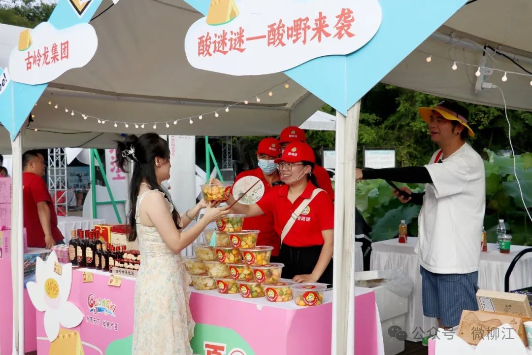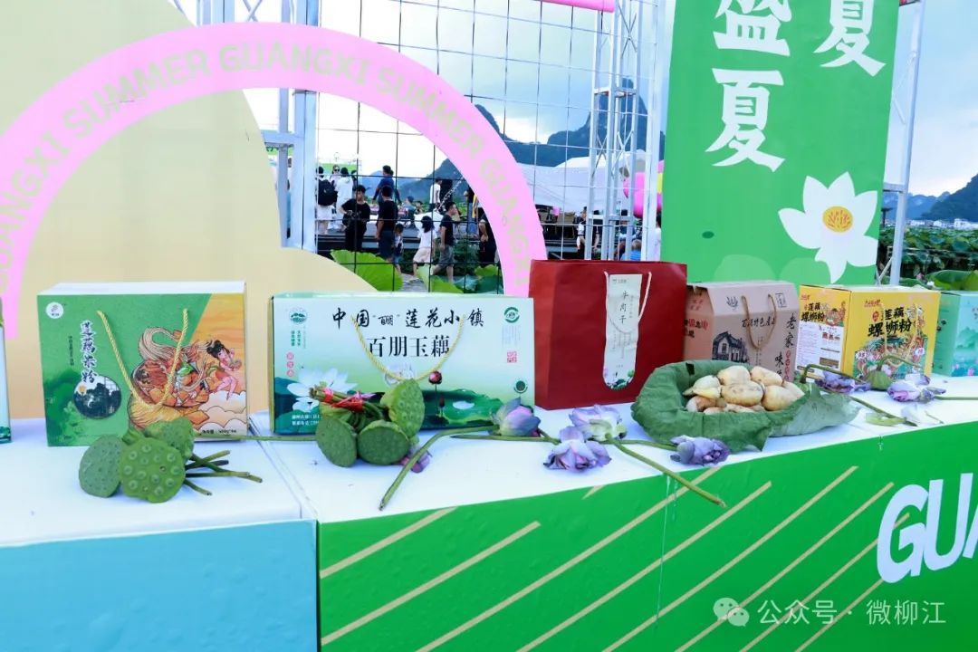 在“荷风雅韵”夏日好物集展位区,汇聚了“荷文化”主题文创产品、手工艺品,及美食品鉴、非遗技艺体验、螺蛳粉等柳州特色元素,游客们在此参与荷花花艺等非遗文化体验,品尝清热解暑的美食莲花宴,感受传统与现代的完美融合。“荷香万里”休闲农业展台上,展示着柳江区百朋镇培育的特色荷花品种与产业发展成果,藕粉、莲心茶等特色农副产品琳琅满目。