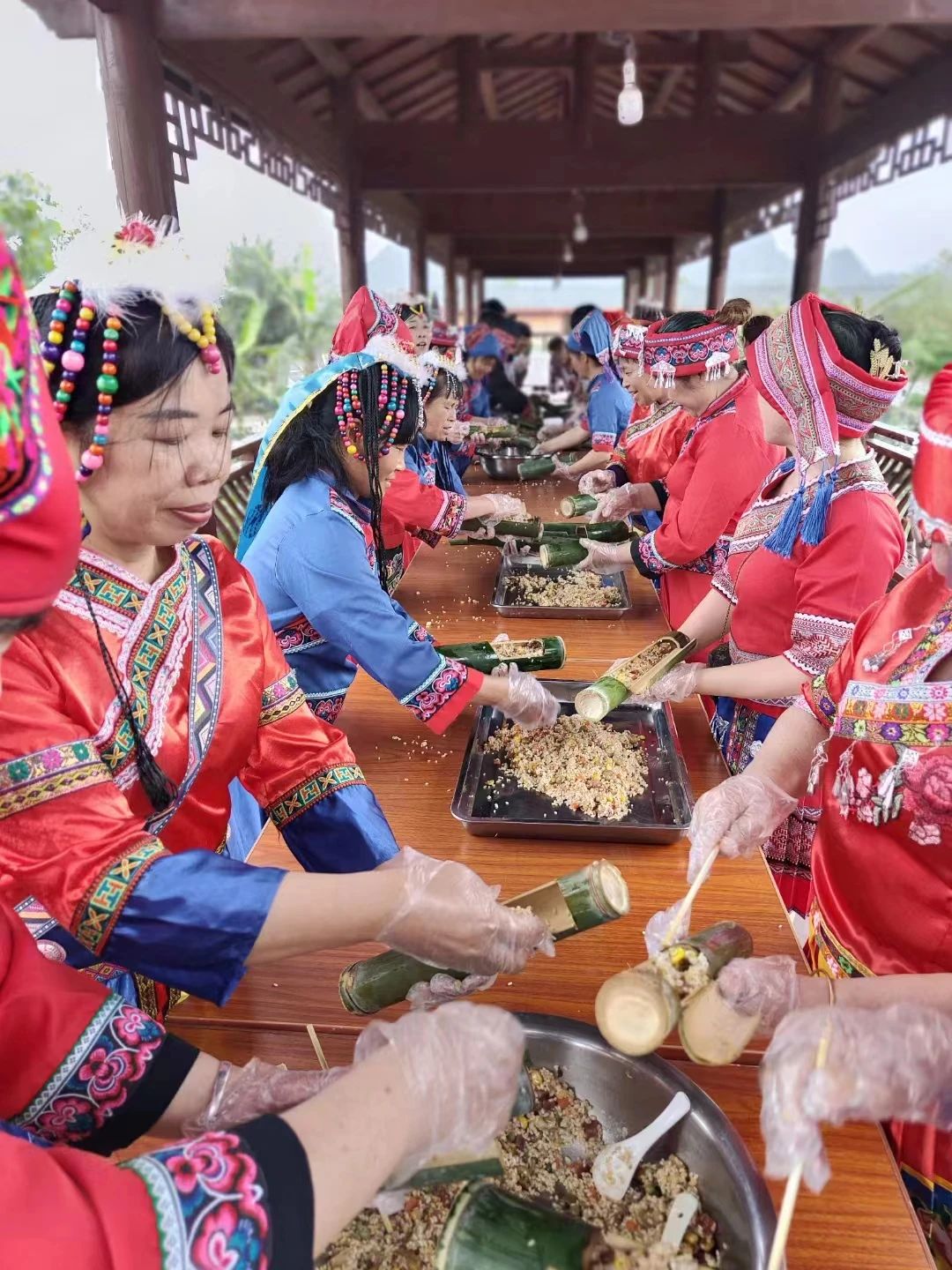 游客与群众一起制作竹筒饭。
