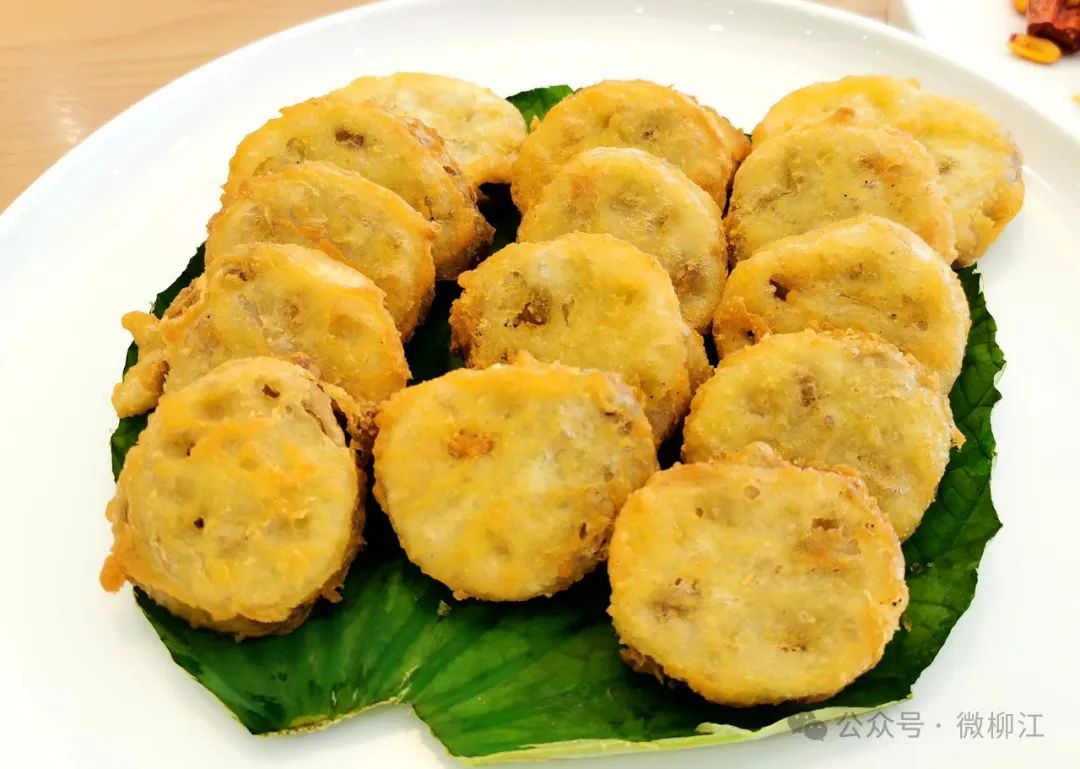 全藕宴都是“就地取材”,莲藕、荷叶等都是现成的。一桌丰富的藕宴上,“清盘”最快的要数炸藕夹了,把藕去皮洗净切成薄的连刀片,把剁好的肉馅均匀地放入藕夹中,裹上提前调好的面糊,裹好的藕夹放入铁锅中油炸至金黄,散发出阵阵藕香,爽脆的藕夹就做好了。咬上一口,外酥里嫩,让人唇齿留香。