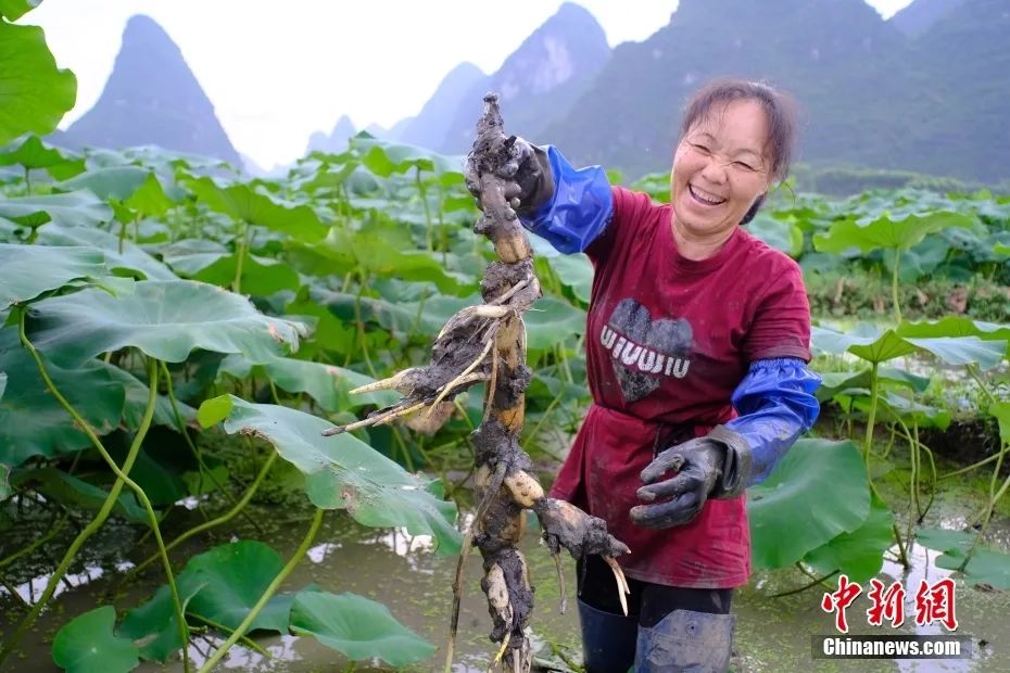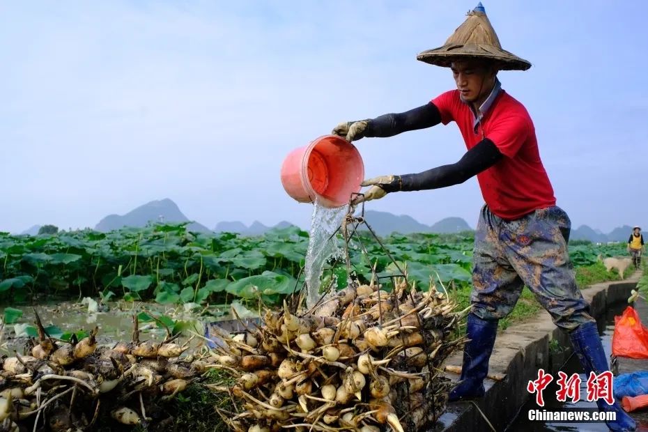 广西柳州市柳江区百朋镇,当地农民在采收莲藕。