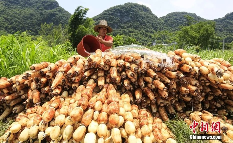 柳州市柳江区素有“中国玉藕之乡”的美称,其产出的莲藕洁白如玉、个大肉嫩。图为广西柳州市柳江区,藕农展示其种植的莲藕。