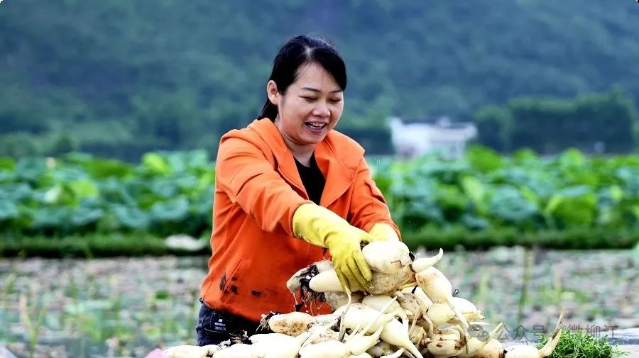 初夏时节,柳江的春季莲藕比其他地方提前一个月左右上市。早熟的莲藕皮白鲜嫩、没有花点,需要用手挖才不会伤到藕,藕农们穿好水裤下到藕田,弯腰、翻泥、用手握住藕节,慢慢捞出淤泥底下的莲藕,挖藕全凭手感和经验。