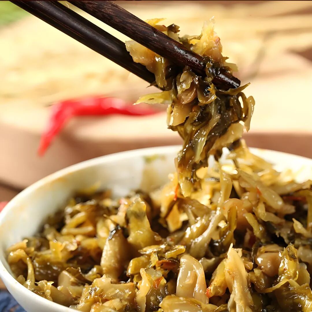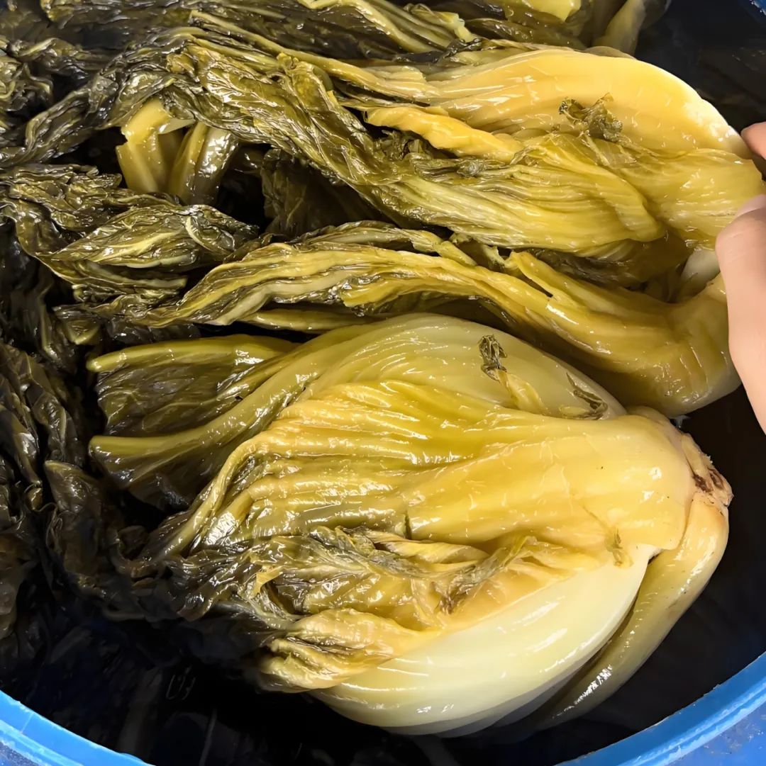 水咸菜是木罗村的一种特色酸菜,本地种植的芥菜个头大、肉质厚,将其清理晾晒、汆烫杀青、调味腌制后,放入菜坑内密封发酵数日即可制成。不仅咸鲜又带有微微酸香,还保留了芥菜的脆爽口感,深受男女老少喜爱。