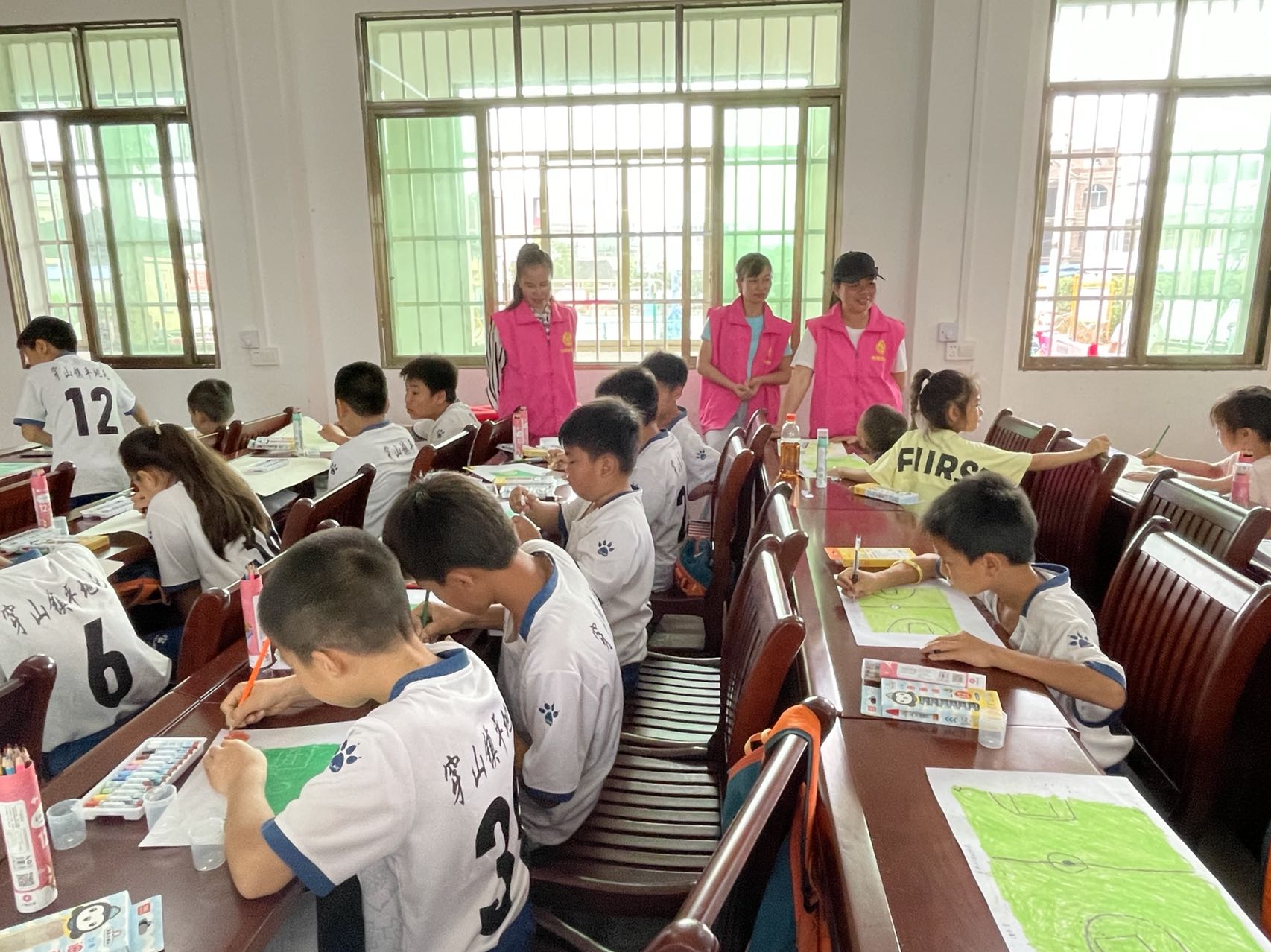 童心看世界,画语展未来。在文化室里,孩子们充分发挥自己的想象力,绘出自己梦想中的足球场和心中最温馨的全家福,他们认真仔细地绘画,用自己纯朴的童心和稚嫩的小手,绘出对美好未来的憧憬和追求。 经过一个多小时的创作,一幅幅栩栩如生的画面跃然于画布上。或许画布上的一幅幅作品尚且稚嫩,但却倾注了一个个美好心愿。