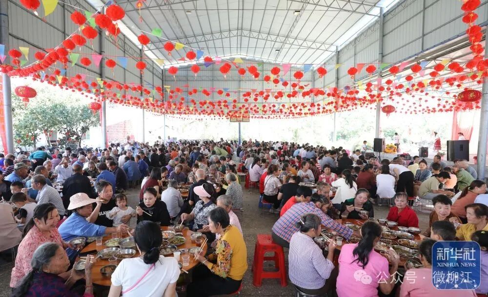10月5日,在柳州市柳江区成团镇甘塘村,人们参加重阳节百家宴。