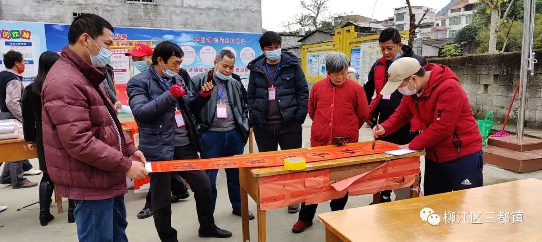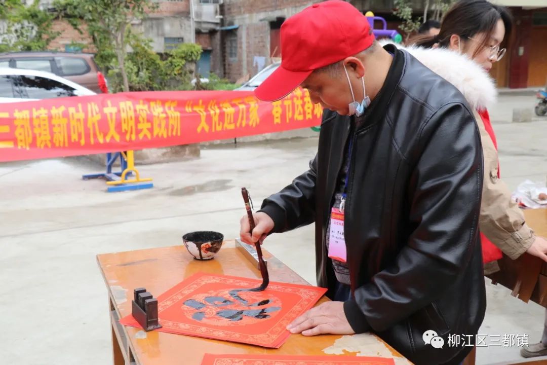 “千门万户曈曈日,总把新桃换旧符。”桃符,也作春联。贴春联是我国辞旧迎新的传统习俗,一幅幅红色的春联是老百姓们过年必须要有的仪式感。1月18日上午,在三都镇三都社区的党建小广场上,区文联、区文化馆、区书法协会及三都镇新时代文明实践所联合开展“文化进万家”春节送福联志愿服务活动,免费为群众写福字、赠春联。此时,小广场上晾晒着不少书法家们刚刚写好的福字和春联,满眼喜庆的颜色直接将年味拉满!