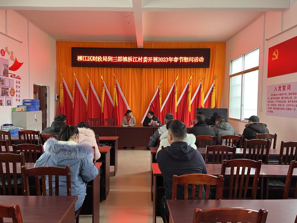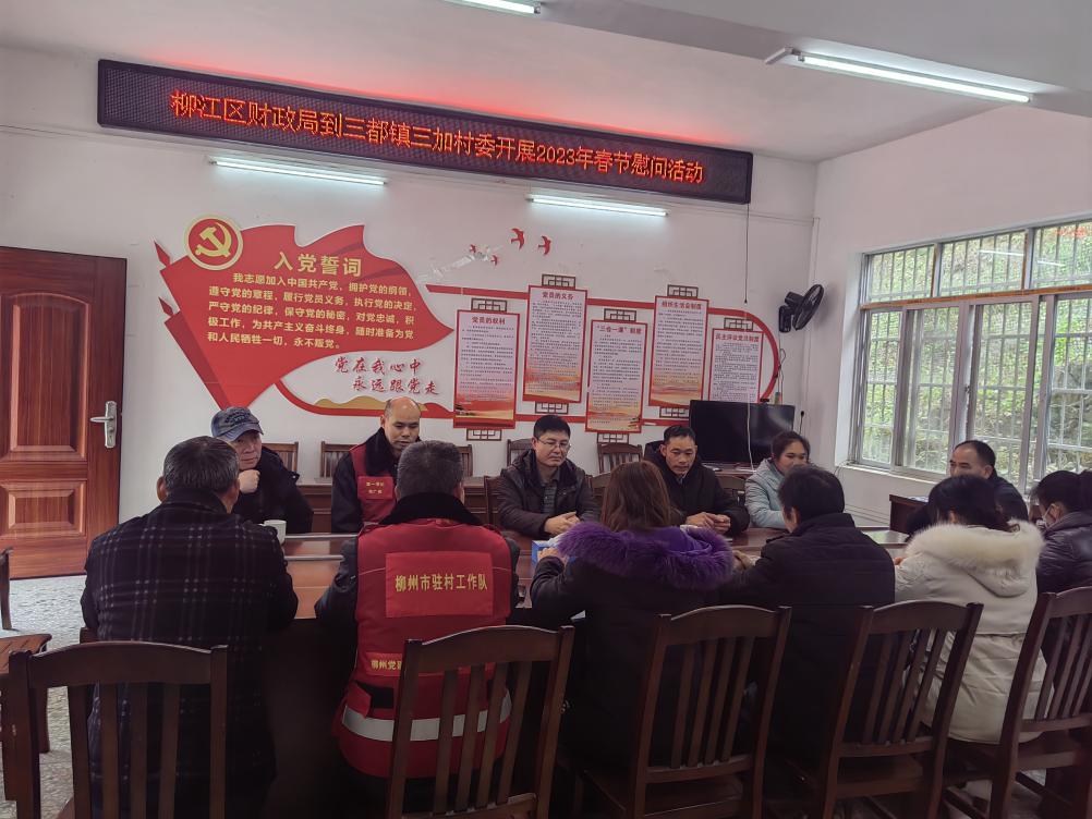 柳江区财政局副局长蓝美霞、覃冠华带领财政局党员干部,分别深入到三都镇三加村、板江村看望慰问村委会干部,慰问组与村干部进行深入交谈,详细询问大家的工作情况,思想动态,以及在工作、生活中遇到的困难和问题;叮嘱大家要主动关心困难群众的生活,了解近期驻村帮扶和产业发展等方面情况,落实纾困帮扶政策。随后为干部们送上米、油和节日祝福,并对村干部在基层一线工作的辛勤付出致以诚挚的感谢。