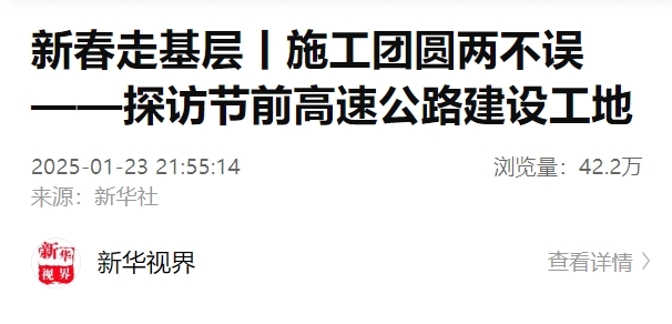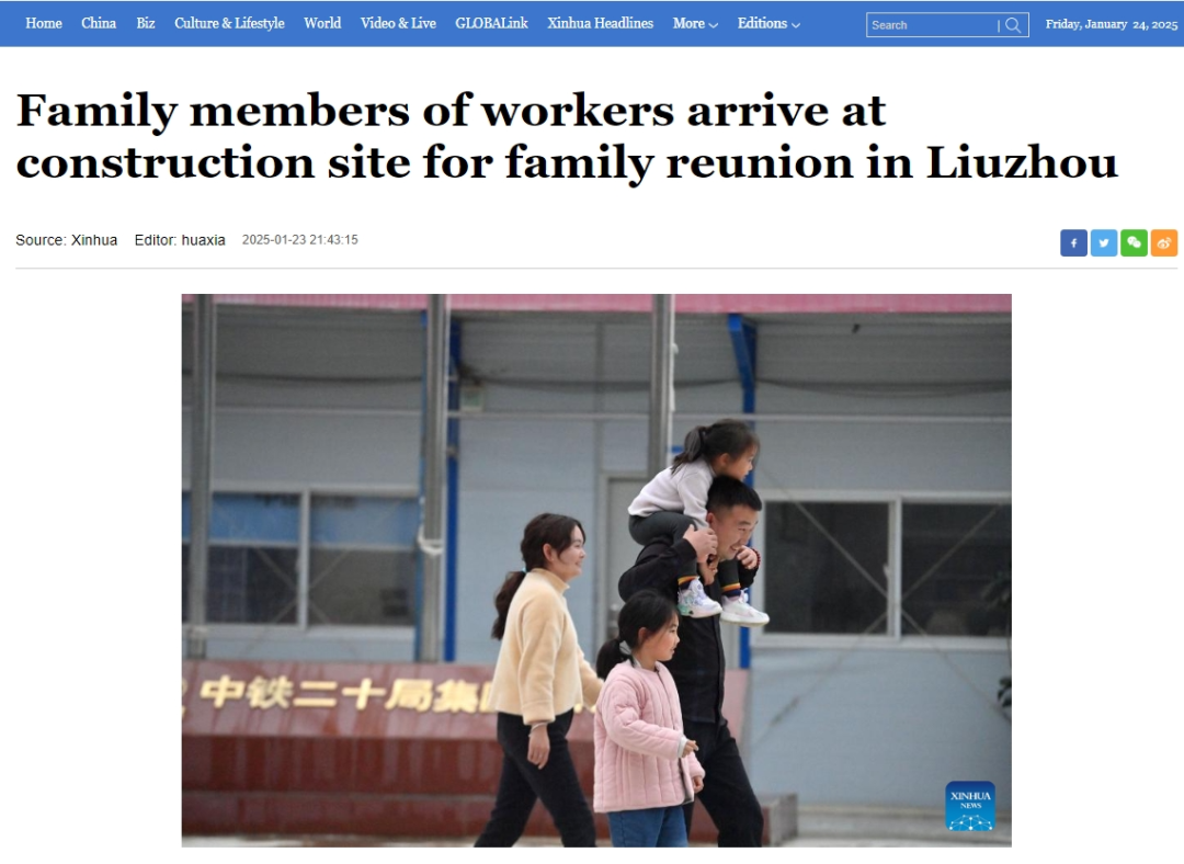 1月23日,新华社推发中英文双语报道《新春走基层丨施工团圆两不误——探访节前高速公路建设工地》《Family members of workers arrive at construction site for family reunion in Liuzhou》。报道柳江区鱼宜高速公路建设项目,百余名建设者坚守岗位,全力推进项目建设,同时,春节将至,建设者和到访的家属一起备年货、贴春联,共同营造温暖的新春氛围。
