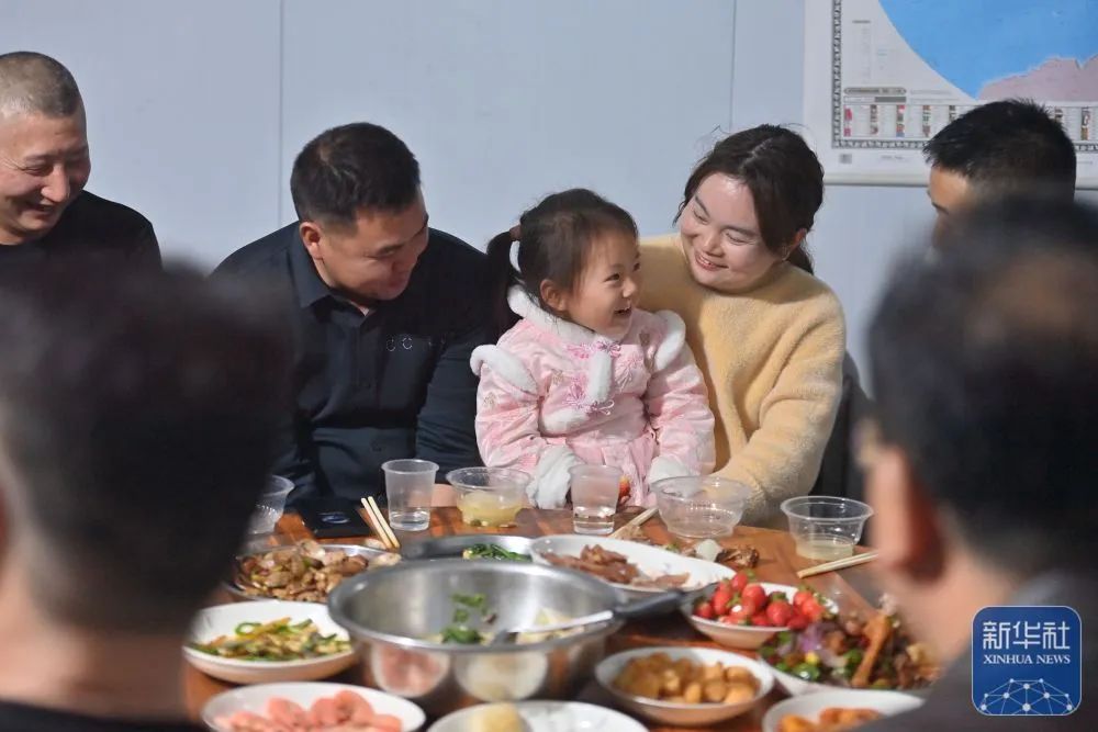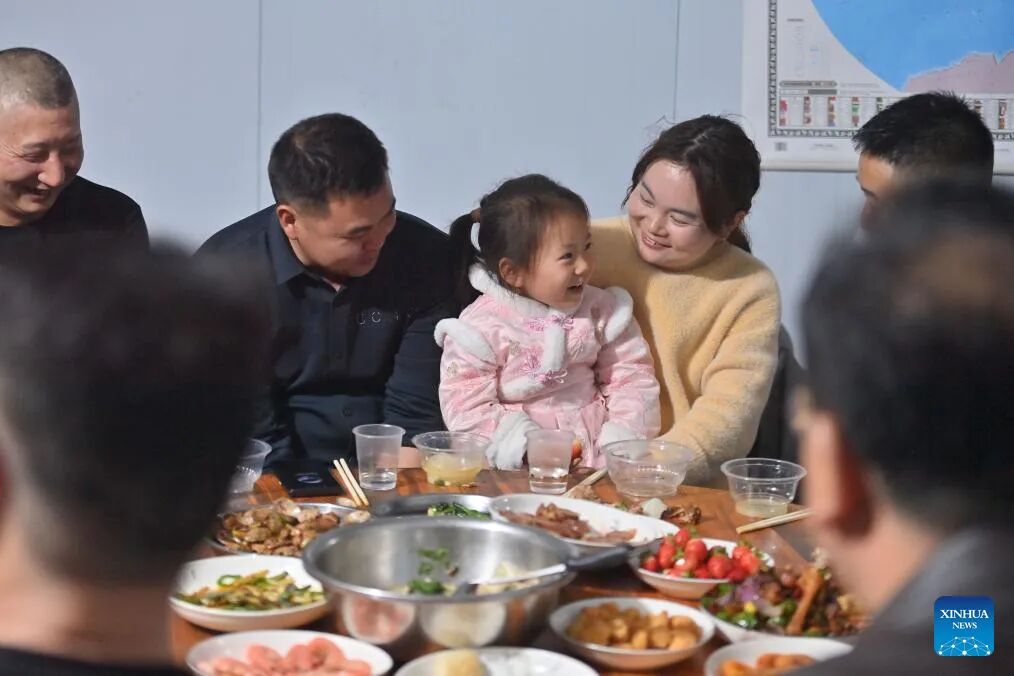Workers and their family enjoy dinner at the construction site of an expressway linking Yufeng and Yizhou of south China's Guangxi Zhuang Autonomous Region in Liuzhou of Guangxi, Jan. 22, 2025.The Chinese New Year, or the Spring Festival, will fall on Jan. 29, marking the beginning of the Year of the Snake. More than 100 workers of China Railway 12th Bureau Group Co., Ltd. will remain at the construction site of an expressway linking Yufeng of Liuzhou City and Yizhou of Hechi City in Guangxi this Spring Festival, China's traditional occasion for family reunion.As the Chinese New Year is drawing near, many family members of these workers have arrived at the construction site in Liuzhou. Meanwhile, a series of festive activities are going on here as well. (Xinhua/Huang Xiaobang)