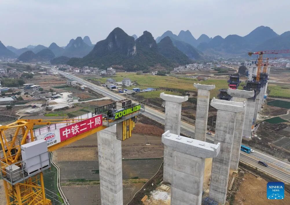 Workers are pictured at the constructionsite of an expressway linking Yufeng and Yizhou of south China's Guangxi Zhuang Autonomous Region in Liuzhou of Guangxi, Jan. 22, 2025.