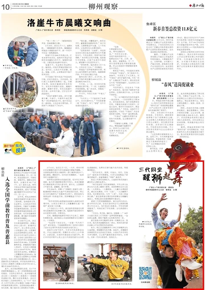 2月20日,《广西日报》“柳州观察”专版刊发《三代同堂 醒狮起舞》,生动描绘柳江区进德镇四连村木岸屯曾家三代人共同传承醒狮技艺的故事。柳江醒狮文化正以年轻化、日常化的方式在新一代中生根发芽,广泛弘扬了中华民族优秀的非物质文化遗产,展现其持久的生命力与时代魅力。