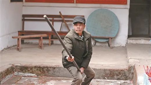 曾亚强向晚辈演示棍法。