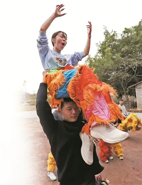 曾玉连是木岸屯醒狮队里唯一的醒狮少女。连日来,她与弟弟曾鹏程各执一狮头,亮相四连村曾氏宗族上灯仪式等民俗活动现场。