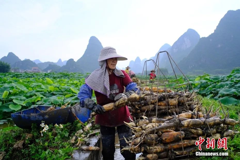 广西柳州市柳江区百朋镇,当地农民在采收莲藕。