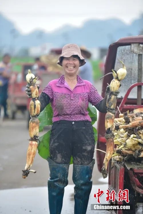 柳州市柳江区素有“中国玉藕之乡”的美称,其产出的莲藕洁白如玉、个大肉嫩。图为广西柳州市柳江区,藕农展示其种植的莲藕。