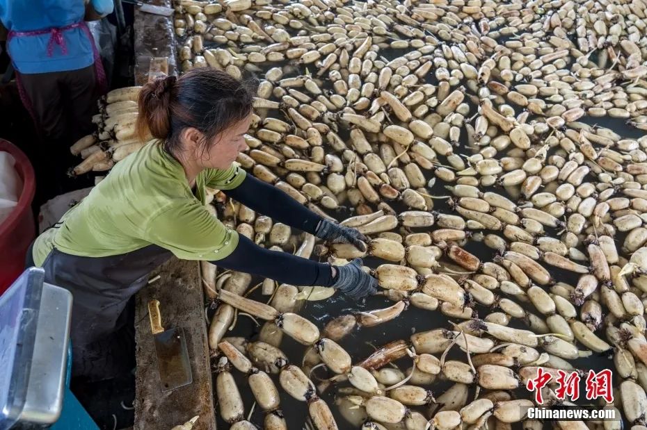 广西柳州市柳江区百朋镇,莲藕加工厂的工人在清洗莲藕。